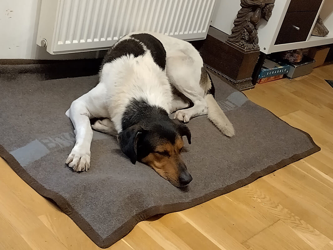 Auf einer Angstskala von 0-10, wobei 0= nix und 10= Todesangst ist,  ist er irgendwo zwischen 2 und 3. Also so gut wie gar nichts. Er hat die Wohnung in Besitz genommen. Hat sich ohne zeigen oder so seinen Platz eingenommen, wo er entspannt und ruhig tief schnarchend schläft.  Er geht super gut an der Leine. Ohne Ziehen. Ohne Stress. Also Spazierengehen ist null Problem. Ja, er erschrickt ganz kurz bei neuen Reizen (Scatern, lauten Motorrädern,  lauten Sirenen von Polizei oder Rettung Highheels, ...) und er ist urlustig. Er lässt sich streicheln und lernt buchstäblich stündlich dazu.  Er ist soviel leichter zu handeln, als wie uns jemals vorgestellt haben. Er ist ein viel einfacherer Hund, als man in der Tierstation in Ungarn jemals glauben hätte können.