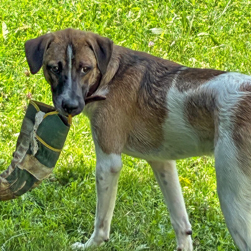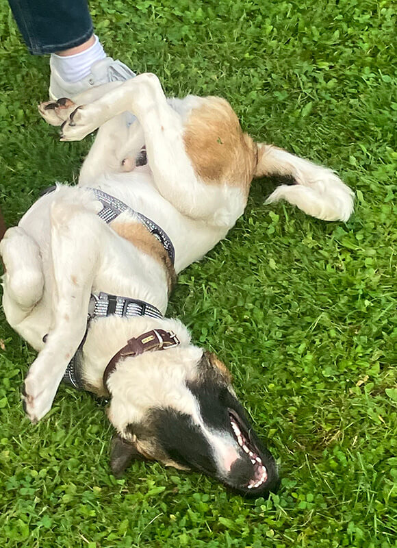 Er springt glücklich im großen Garten herum (hat nie versucht, wegzulaufen), stiehlt unsere Arbeitshandschuhe und anderes und ist der Pele unter den Hunden, das heißt, wir spielen mit echten ledernen Fußbällen. Er ist eine große Hilfe bei den Gartenarbeiten, wenn er nicht gerade die Pflanzen ausgräbt, unter denen sich wohl Wühlmäuse befinden.