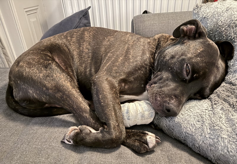 Er weiß wohl nicht, welchen Ruf er als Staffordshire Terrier hat, denn er ist ein sehr liebevoller Hund und zeigt seine Zuneigung mit vielen Bussis, vor lauter Übermut auch einmal mit einem Liebesgeknabbere am Ohr.