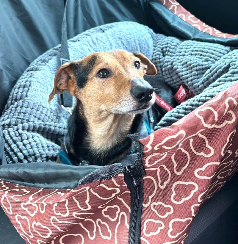 Lexi ist stubenrein und fährt ruhig im Auto mit. Das Alleinbleiben wird aktuell noch geübt, klappt jedoch für eine angemessene Zeit gut.