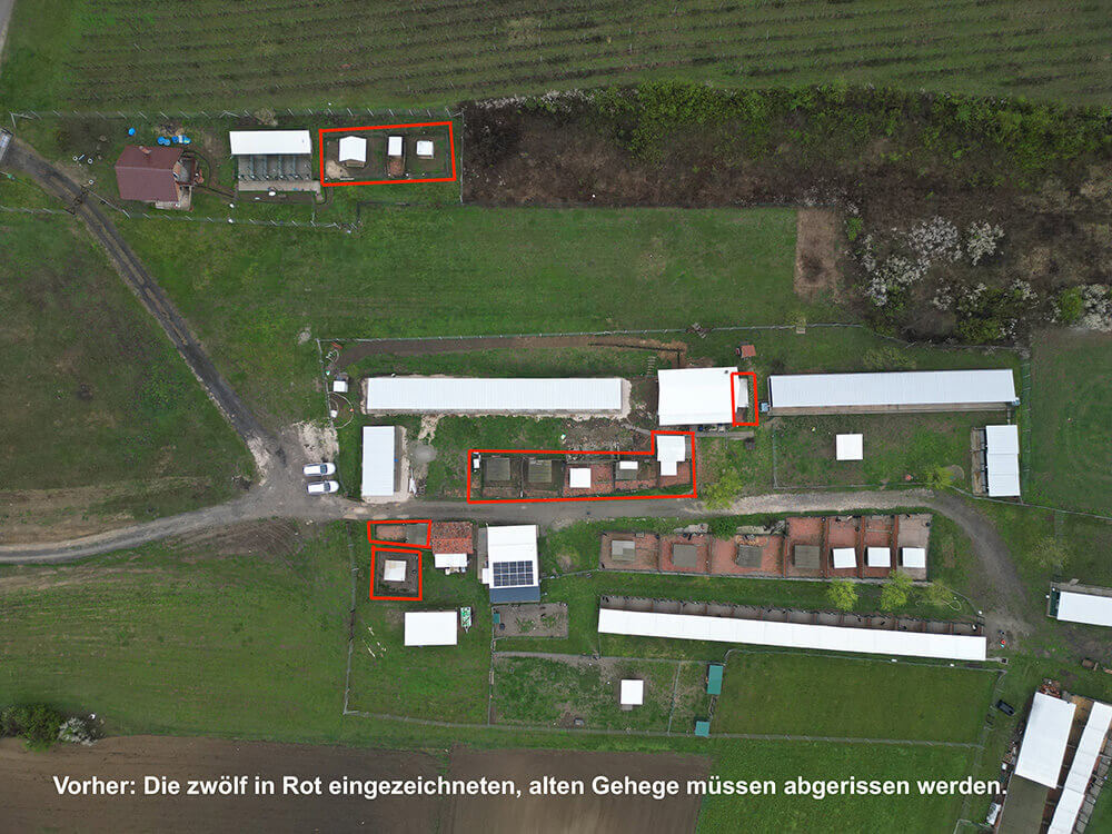 Mai 2025: Die im März von den Freiwilligen freigelegte Fläche wird nun für einen großen, neuen Auslaufbereich genutzt. Mittels Bagger wurde die Fläche begradigt und letzte Betonfundamente entfernt. Außerdem wurde ein Zaun aufgestellt und Gras angepflanzt. Der Auslaufbereich schließt (wie im Ost-Teil des Tierheims) direkt an die Hundegehege an und so muss nur noch die Gehegetüre geöffnet werden, damit die Hunde direkt auf die Auslaufzone flitzen können.